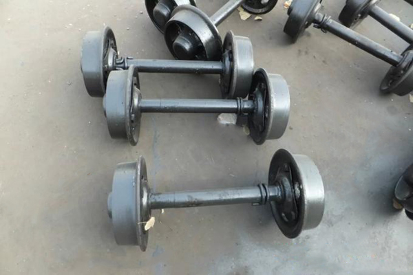 矿车轮对是机车车辆上与钢轨相接触的部分,由左右两个车轮牢固地压装在同一根车轴上所组成。轮对的作用是保证机车车辆在钢轨上的运行和转向,承受来自机车车辆的全部静、动载荷,把它传递给钢轨,并将因线路不平顺产生的载荷传递给机车车辆各零部件。此外,机车车辆的驱动和制动也是通过轮对起作用的。对车轴和车轮的组装压力和压装过程有严格要求,轮对内侧距离必须保证在1353±3毫米的范围以内。为保证机车车辆运行平稳,降低轮轨相互作用力和运行阻力,车轴轴颈和车轮踏面的加工椭圆度和偏心度,以及轴颈锥度都不得超过规定限度。随着运行速度的提高,轮对均衡日益具有不可忽视的重要性。